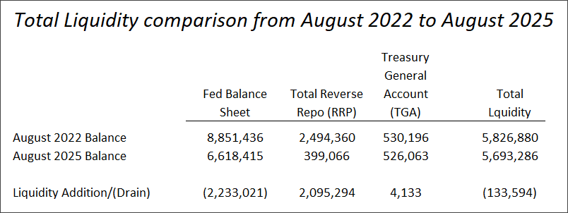 Liquidity in our financial system refers to the overall amount of readily available money and credit in the financial system that can be used for spending, lending, or investment. It includes cash, bank reserves, money market balances, and short-term funding available to financial institutions and markets. You’ve heard about the Fed increasing or decreasing liquidity. You may also know that running big budget deficits also keeps liquidity high. High liquidity energizes asset prices and the economy.